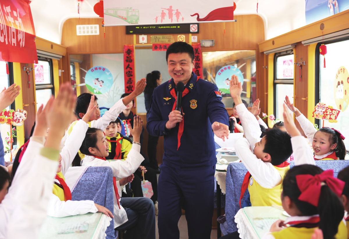 少先队辅导员和队员们一起乘坐T147次“红领巾号”列车,开展少先队活动