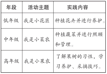 低年级队员学习花卉栽培技能:松土、浇水、翻盆、移株……在辅导员的引导下,他们还为花卉制作“名片”,分享种植心得。中年级队员学种青菜、山芋和马铃薯等,虚心向中队辅导员请教种植技巧,一边实践,一边记录观察日记,分析土壤成分,进行比对实验,不断总结、积累经验。高年级队员学习果树的日常养护技巧,在辅导员的带领下采摘成熟果实、分拣包装、尝试宣传推销,还在无锡市东港镇苗木种植专家侯维生的指导下,学习防寒防冻技术,为果树穿上“冬衣”,体验劳动带来的苦与甜。
